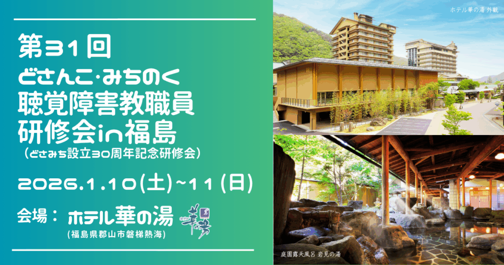 2026年1月10日(土)~11日(日)、福島県郡山市・磐梯熱海にて開催いたします。今回は、どさみち設立30周年にあたる記念の研修会です。これまでの歩みをふり返りつつ、温泉に浸かり、自慢の料理を堪能しながら、手話で語り合いましょう。